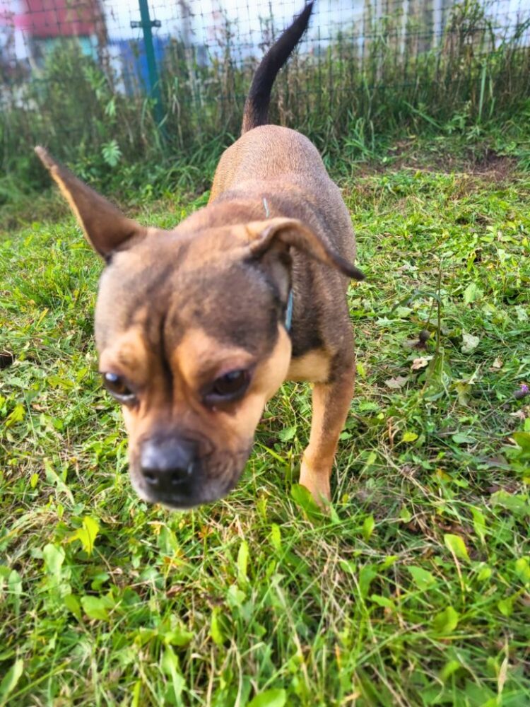 Bulė, eine kleine Bulldogge-Mischlingshündin, kam aus einem Dorf in der Nähe von Kretinga ins Tierheim. Die Leute sagten, sie hätte Hühner gejagt. Dieser hübsche Vogel fliegt nicht gleich auf den ersten, den er trifft, zu, aber unsere Freiwillige hat mit Würstchen Bulytės Vertrauen und Freundschaft gewonnen.